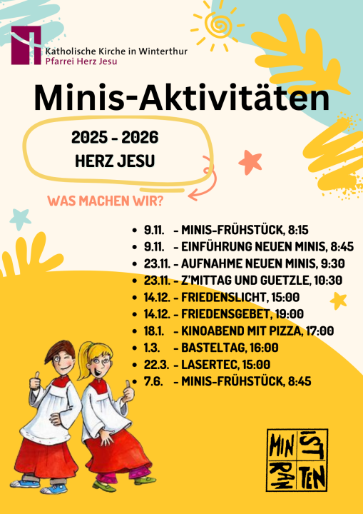 Kinder und Jugendliche wirken aktiv als Ministrantinnen und Ministranten bei den Gottesdiensten mit. Nach der Erstkommunion können die Kinder im Anschluss an eine kurze Ausbildung für den Ministrantendienst aufgenommen werden.